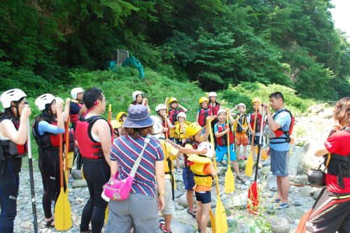 ラフティング乗船まえの安全の説明です。なんか真剣になってきましたねー