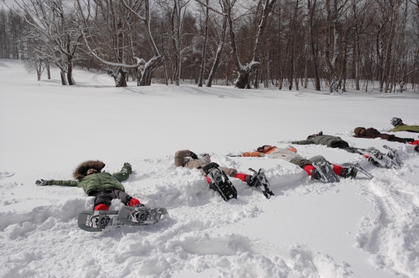 スノーシューは雪の上をフワフワと浮んで歩く感じがします。ツアー中、平地と若干の登り坂で使用します。